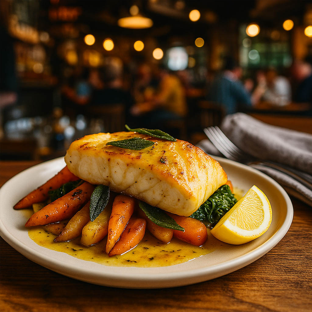 Why this dish works: The flaky, mild Cape Hake holds its shape under searing, the sage-butter lends luxury warmth, and the roasted roots tie to fall harvest menus.