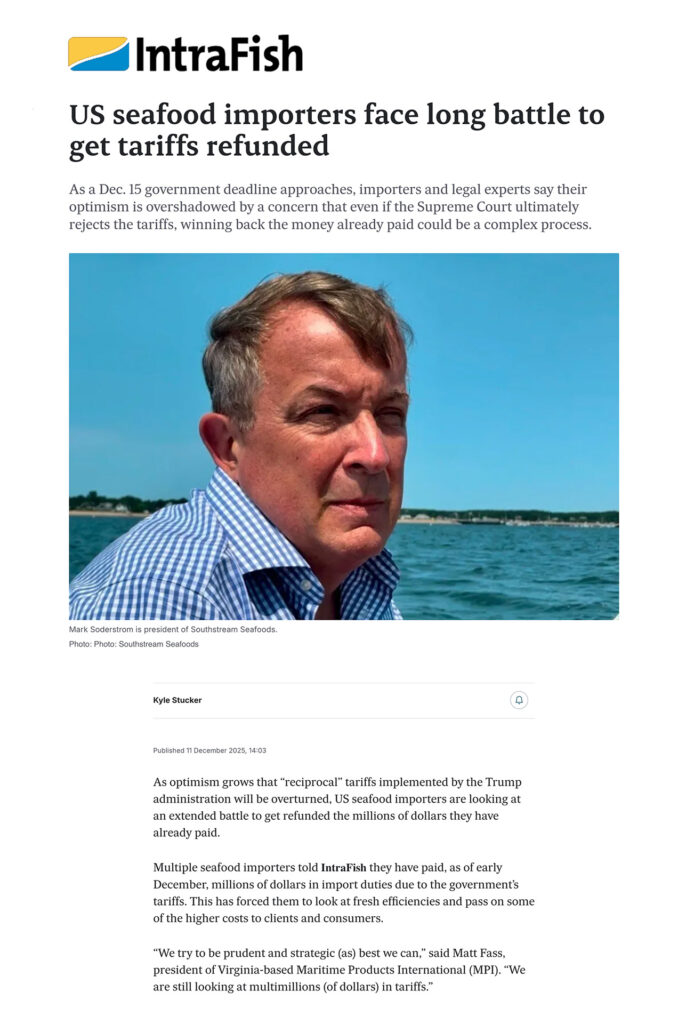 The article notes that several large seafood companies — including Costco, Bumble Bee Foods and Netuno — have filed lawsuits seeking relief from the tariffs and potential refunds. However, legal experts interviewed by IntraFish cautioned that even if the Supreme Court ultimately rules against the tariffs, reclaiming funds already paid may prove difficult once import entries are officially “liquidated.”